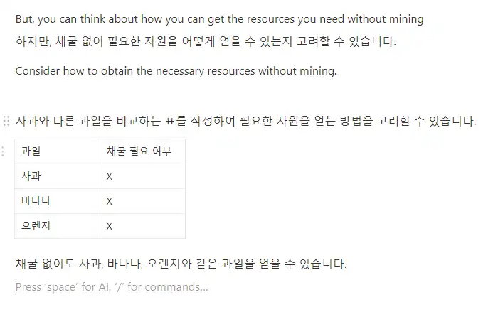 위는 기능들을 이것저것 시험한 페이지인데, 챗지피티와 기능을 비교하기 위해 '사과와 다른 과일을 비교하는 표를 작성해 줘'라고 입력했지만, 맥락을 읽고 채굴과 관련되었다고 판단해 저러한 표를 내놓았습니다. 이런 문서의 맥락을 읽어내는 것이 가장 큰 차이점이지 않겠나 싶군요.