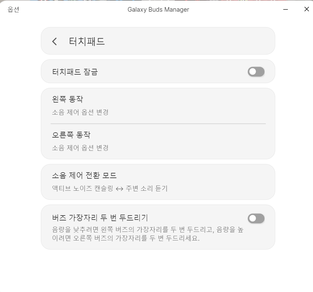 연동하면 이렇게 각 버즈의 배터리, 전압은 물론 온도와 착용유무까지 알수있습니다. 다음으로는 각 매뉴마다 설정할수 있는것들을 설명해보겠습니다.